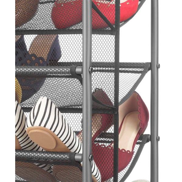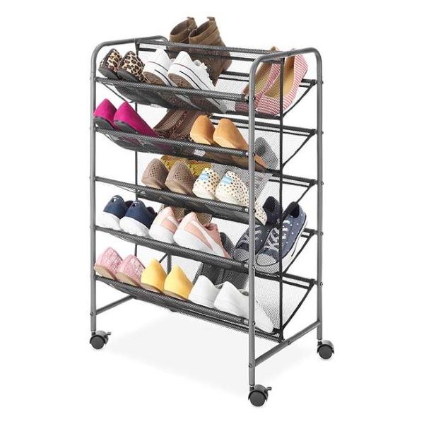 Features wheels for easy moving, 2 locking wheels 2-sided design holds up to 30 pairs of shoes Easy assembly with tools included Item measures 17 x 24.6 x 35.5 in - 43.1 x 62.4 x 90.1 cm