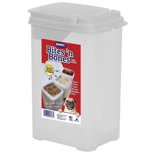Super wide flip top is ideal for dispensing all different sizes of treats & chews. Bag-in feature allows dispensing of seeds or treats from the original bag.