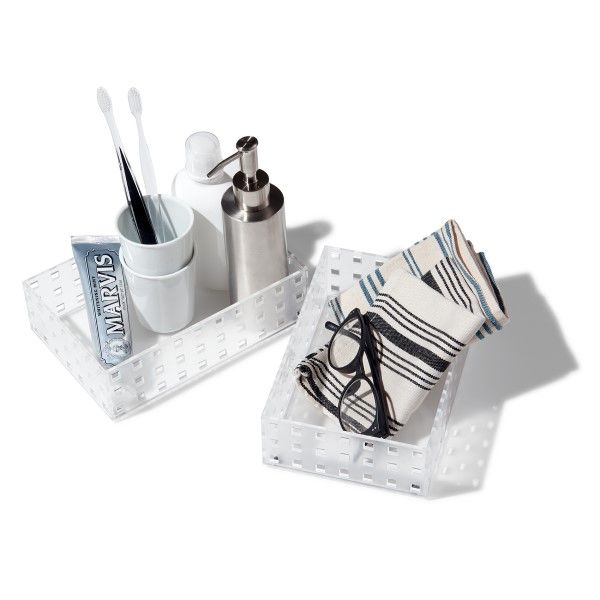 Organize drawers or desktop, in the bathroom, kitchen, or office. These handy bins can be stacked to optimize desk or countertop space for office supplies and cosmetics. To organize drawers, lay Bricks side by side, or stack in deeper drawers – the easy slide action makes everything accessible.
