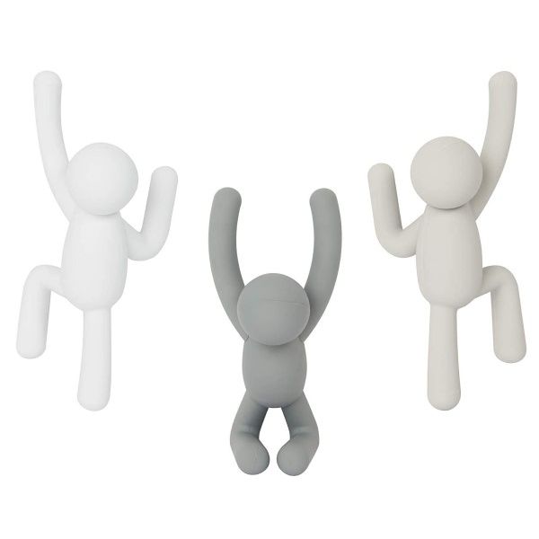 Buddy Hooks are a playful, yet modern set of 3 hooks, constructed of durable molded polypropylene. The hooks are a functional and space-saving alternative to a traditional coat rack. Giving the illusion Buddy characters are climbing up a wall, the hooks add character and personality to a space, while keeping coats and accessories organized, and accessible. They serve as quirky wall décor even when not in use. The head, arms and legs provide a convenient place to hang your items, including coats, scarfs, purses, backpacks, and umbrellas. The Buddy hooks can add a fun accent to any space, whether it be an entryway, bedroom, bathroom, dorm room or office. Buddy Wall Hooks measure 3 x 6.5 x 3 inches and support a maximum load of 5lbs. per hook. They are easy to install, coming with clear step-by-step instructions, and the concealed mounting hardware creates a seamless appearance.