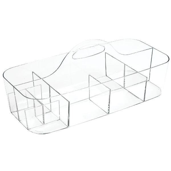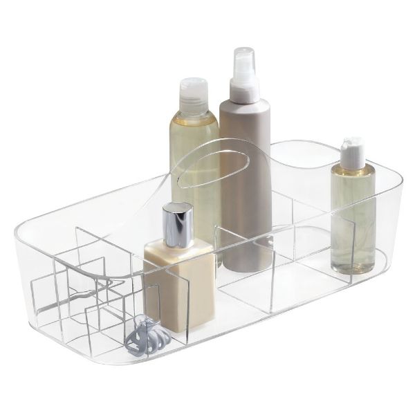 Practical design provides efficient and trendy storage for bath essentials. Center raised handle for easy transportation Holes at the bottom for water drainage. This divided organizer provides convenient storage for your most reached-for bath essentials.