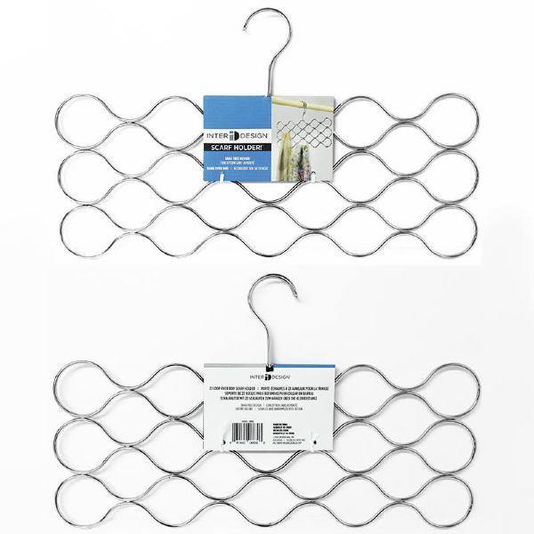 A continuous wavy pattern enveloped by durable steel and an attractive chrome finish. Scarf hanger with twenty-three loops Snag-free design No hardware required; hangs over closet rod or hook Made of durable steel; Silver finish 16.5 x 0.75 x 6.75 IN / 41.91 x 1.9 x 17.15cm