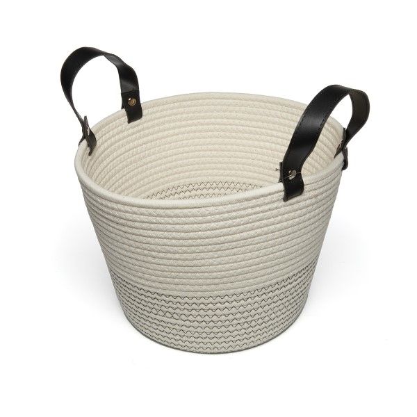 This attractive two-tone basket is made from 100% cotton rope – sustainably farmed and completely renewable. The dark overstitch on the lower layer creates the two-tone appearance. Black leather look handles add a sophisticated element to the basket.
