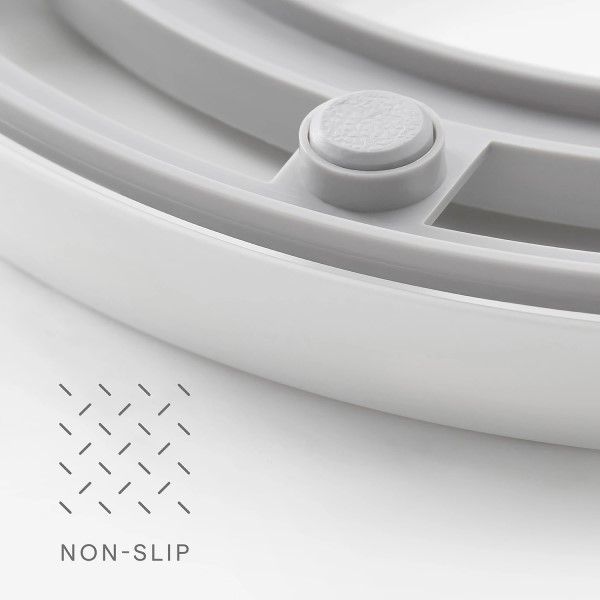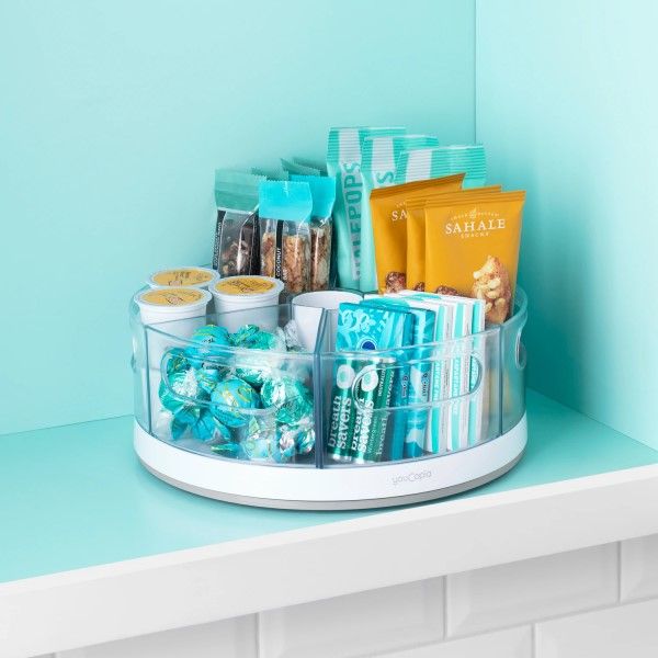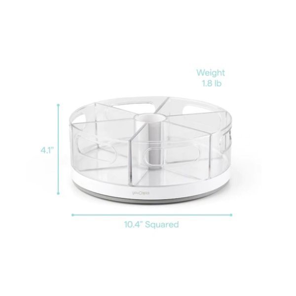 The Crazy Susan Turntable with 6 Bins organizes small items like snacks, packets, pouches, makeup, medicine and office supplies. It helps you quickly spin and select what you need from removable bins and a center cup. When little things are organized, you can focus on the big picture. Includes 6 removable clear bins with handles Smoothly rotates on stainless steel ball bearings Soft, non-slip feet hold steady in the cabinet Simply place items inside, no assembly required Measures 10.4D x 10.4W x 4.1inH. Made from high-quality, BPA-free plastic that’s easy to clean. Organizes small things in kitchen, bathroom, office, craft and kid rooms.