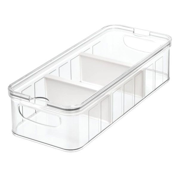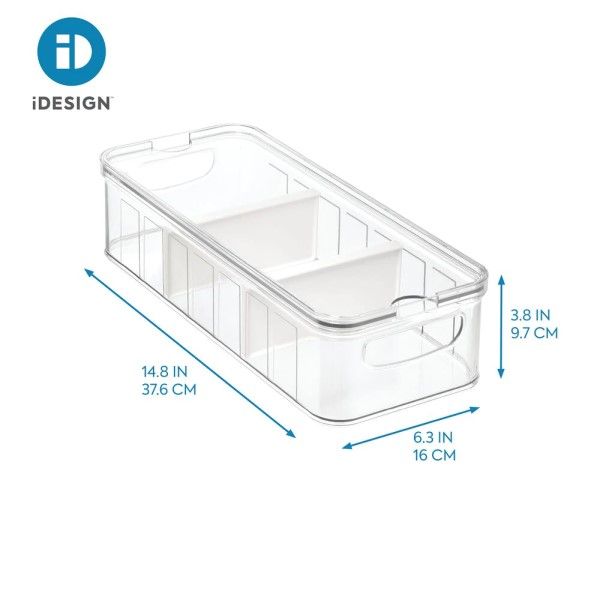 The large divided Crisp Refrigerator Bin is a versatile addition to your home. This quality bin is made of clear, BPA-free, durable plastic that lasts for years of use. This item is perfect for storing food, craft supplies, cleaning supplies, and more. Use the integrated handles to place items in the fridge, in the freezer, on your countertop, or on a shelf for organization anywhere. With movable dividers, you can customize the size of each section in the bin to suit your needs. The transparent material allows you to easily see your items. Measuring 14.82" x 6.32" x 3.76", this storage bin is useful for any room in your home.