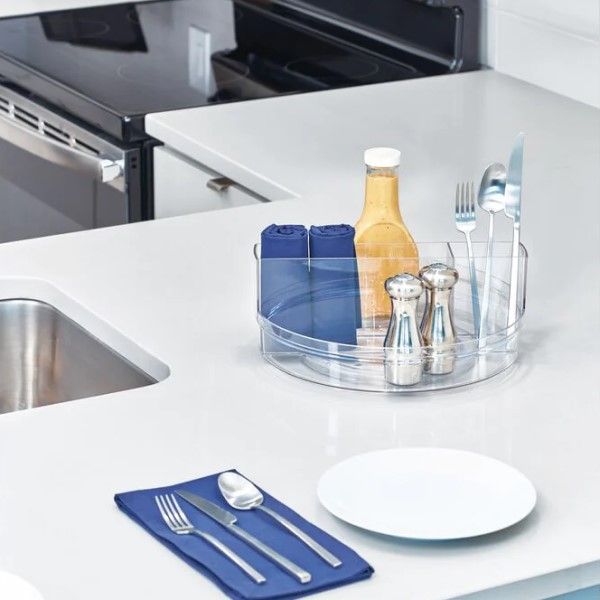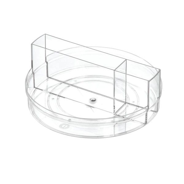 Upgrade your kitchen storage with the iDesign Crisp Rotating Tabletop Organizer made with iD renew 100% Post-Consumer Recycled Plastic Designed with a large bottom tray and a two-section center divider compartment, this turntable provides storage for napkins, flatware, cutlery, seasonings, condiments, and more on kitchen and dining room tables. The open top with raised sides keeps items easily accessible and prevents them from falling out while turning the organizer. This versatile turntable can also be used in the bathroom, bedroom, closet, office, or anywhere you need additional organization. Made with durable 100% post-consumer recycled plastic that is BPA-free, it stands up to every day use and is easy to clean with mild soap and water.