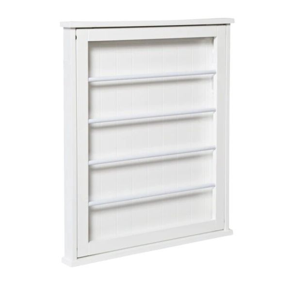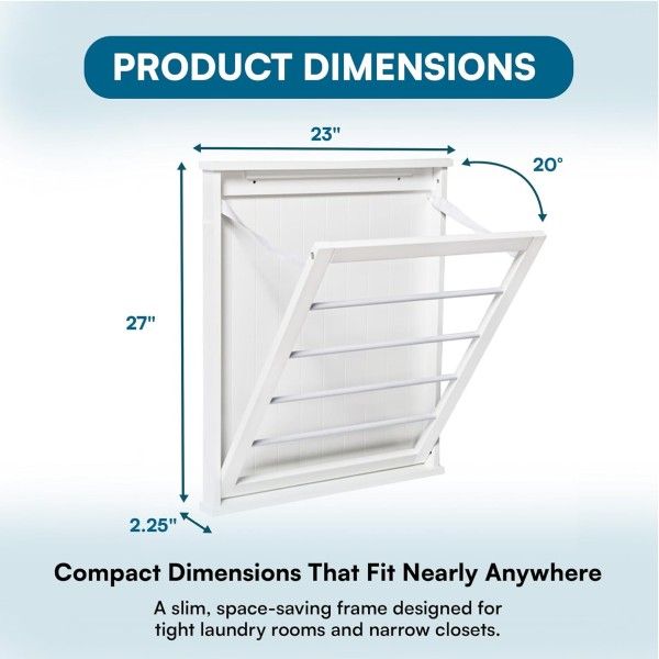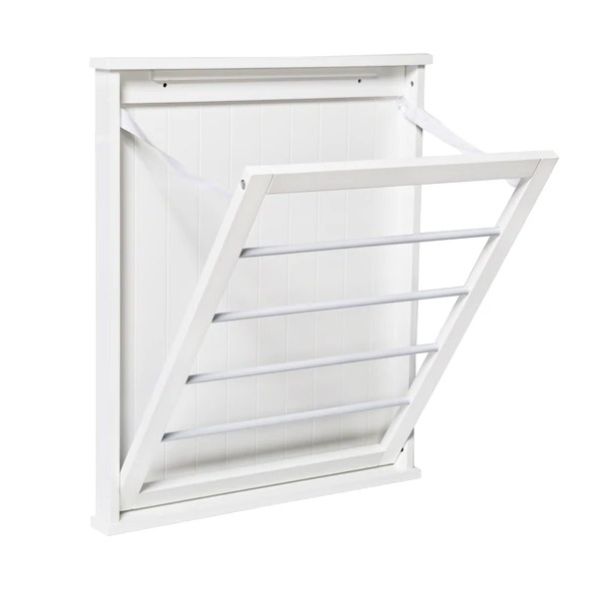 Free up precious floor space with this sleek, wall-mounted drying rack. Hanging bar folds flat when not in use and can hang at 45 or 90 degree angles. White finish matches any décor and looks inconspicuous when not being used.