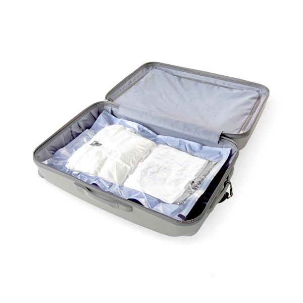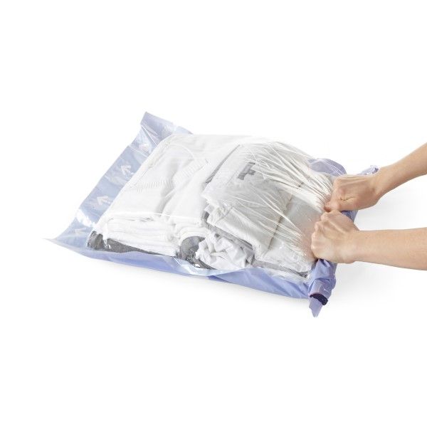 Perfect for creating more packing space when you are going on holiday. Fill the bag, roll the bag from the sealed end, once the air is expelled, seal the zipper almost completely and push a little more air out – complete the seal and you are ready to go. You will be able to pack 50% more clothes for your holiday or leave space to bring back some holiday finds! This works well for backpacks and suitcases. May also be used to keep clean clothes separate from those you have already worn.
