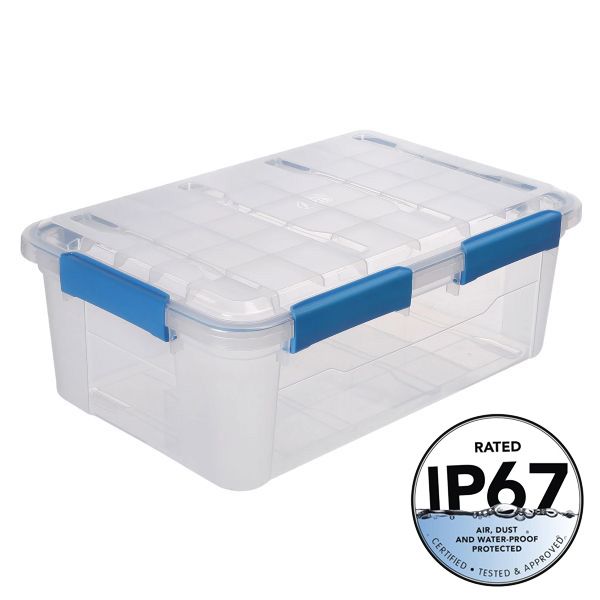 Protect your belongings from moisture and dirt with ezystorage Water-Proof storage totes. These totes hold an IP67 Ingress Protection Certification which means they've been tested to handle being submerged in water up to a meter deep for 30 minutes without water getting in. They're perfect for protecting your belongings from dampness in garages, basements and sheds as well as for use when camping or boating.