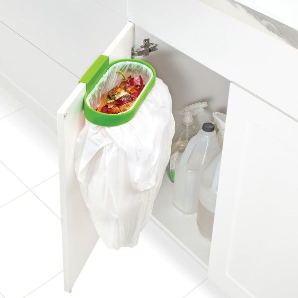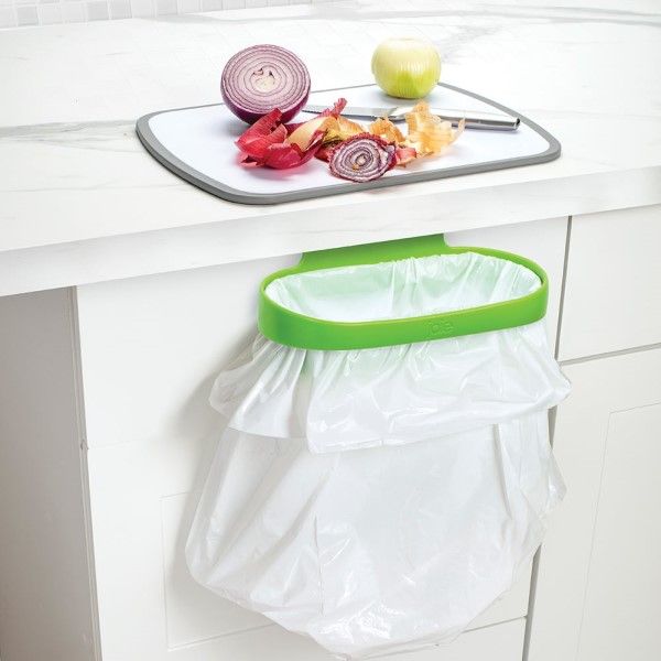 Hook over the edge of any cupboard door or drawer for convenient trash disposal