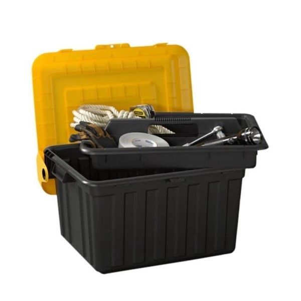 The Durabilt Tote Locker with Tray from Homz is made from heavy duty LDPE resin that's shatter proof and dent resistant, and stands up to extreme weather elements. Includes a removable tray for organizing tools or other smaller items so they don't get lost in the bottom of the tote. The hinged lid snaps closed securely.