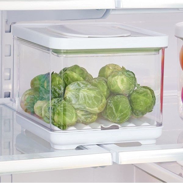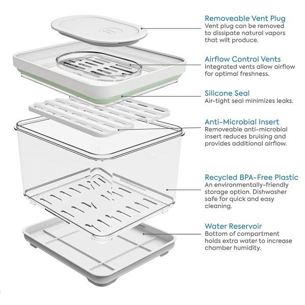 Keeps produce fresh longer and extends the life of your favorite fruits and veggies, and the 12-cup capacity is great for storing smaller quantities in the fridge or on the countertop Airtight lid with integrated vent and removable cover allow you to adjust the humidity inside the bin, and the bottom compartment can be filled with water for extra humidity Removable ridged insert reduces bruising and provides additional airflow, keeping the produce stored at the bottom just as fresh as the produce on top! Can be stacked with additional bins or bowls from the IDFRESH collection to maximize storage space on shelves and to create an effortlessly coordinated and organized kitchen Made with recycled BPA-free plastic for a more environmentally-friendly storage option, and it is dishwasher-safe for quick and easy cleaning