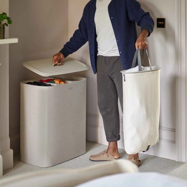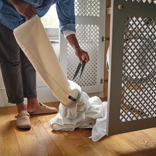 Removable, easy-carry tote bags make for effortless emptying, while the versatile Ecru colourway blends seamlessly into any room. Three 30-litre compartments allow for easy separation of fabrics, such as lights, darks and colours Removable tote bags with handles makes carrying washing to the machine easy