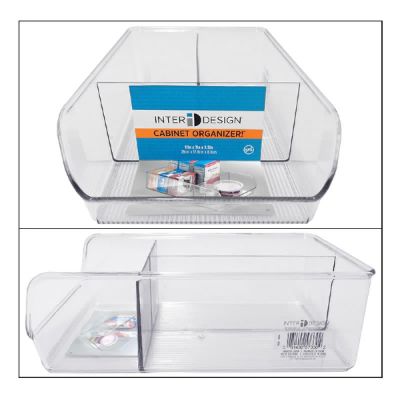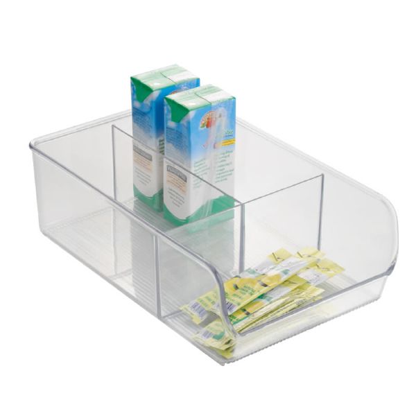 Divided storage for the refrigerator boasting a linear pattern, a durable construction and transparent surfaces. Divided storage bin Three compartments Hand wash only Made of BPA-free Resipreme Plastic 11 x 7 x 3.5 IN / 27.94 x 17.78 x 8.89cm