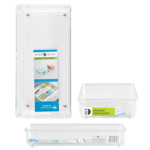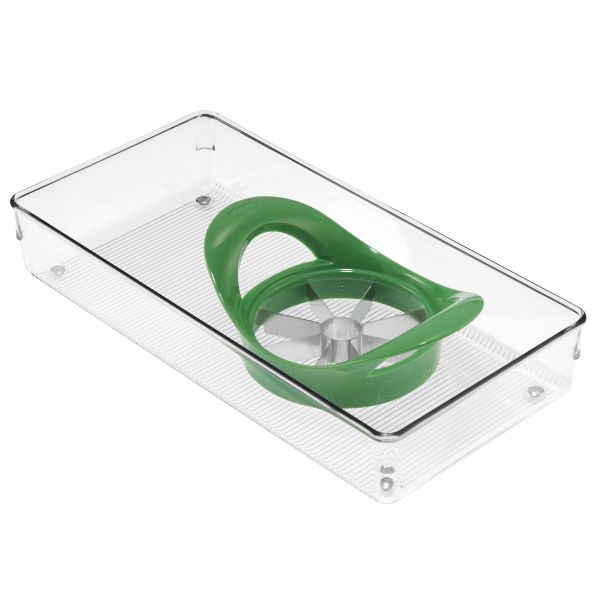 Kitchen drawer organization offering a clean look and transparent surfaces for easy visibility. Drawer organizer bin Fits most size drawers Non-skid feet Made of durable, BPA-free plastic Create a custom drawer configuration; combine any of the following # 10980, 10981, 10982, 10983, 10984, 10986, 10987 6 x 12 x 2.25 IN / 15.24 x 30.48 x 5.7cm
