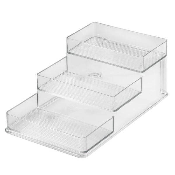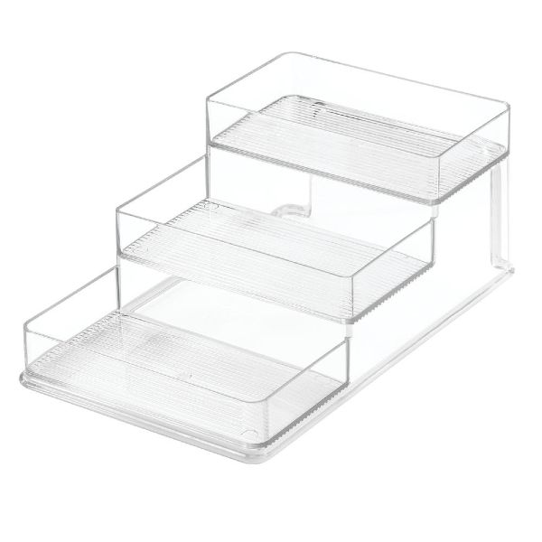 Free up some space in your crowded cabinets and pantries with this Linus 3 Tier Rack Tiered for easy viewing and identification Made of BPA-free Resipreme Plastic Fits into cabinets or on counter tops. Great for the bathroom too - stacking medicines & vitamins 6.25 x 10.25 x 4 IN / 15.88 x 26 x 10.16cm