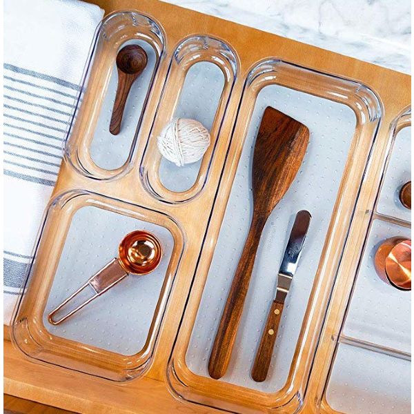 Eliminate clutter in any drawer. These sturdy organizers offer flexibility for storing kitchen utensils and gadgets, craft supplies, jewelry or accessories. Soft lining that prevents scratches. Non-slip rubber feet Combine different sizes to create a customized solution for each space - #10851, 10852, 10853, 10854, 10855 15.75 x 6.88 x 1.88 IN / 40.01 x 17.46 x 4.78 cm