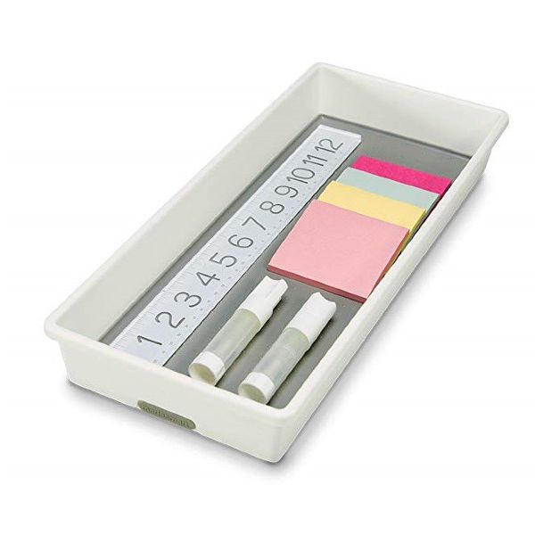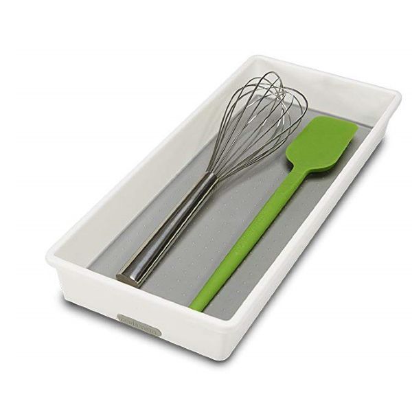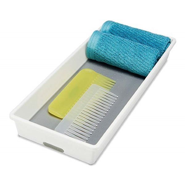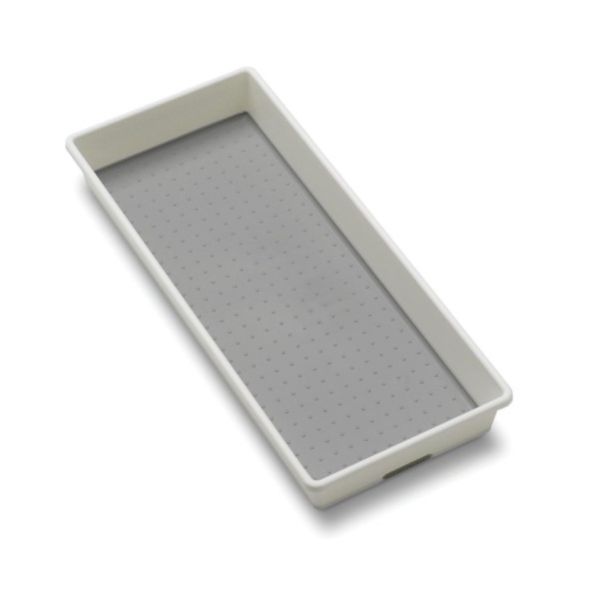 A versatile bin that can be used to organize drawers throughout the entire home. Soft-grip lining and non-slip rubber feet ensure that items stay in their place. Rounded corners allow for easy use and cleaning Made of high-quality, BPA-free plastic for long lasting organization. Non skid feet to prevent shifting Antibacterial gray over mold Use with items 10836, 10837, 10838, 10839 to customize your drawer 15.5 x 6.75 x 2.13 INH / 39.37 x 17.15 x 5.41 cm