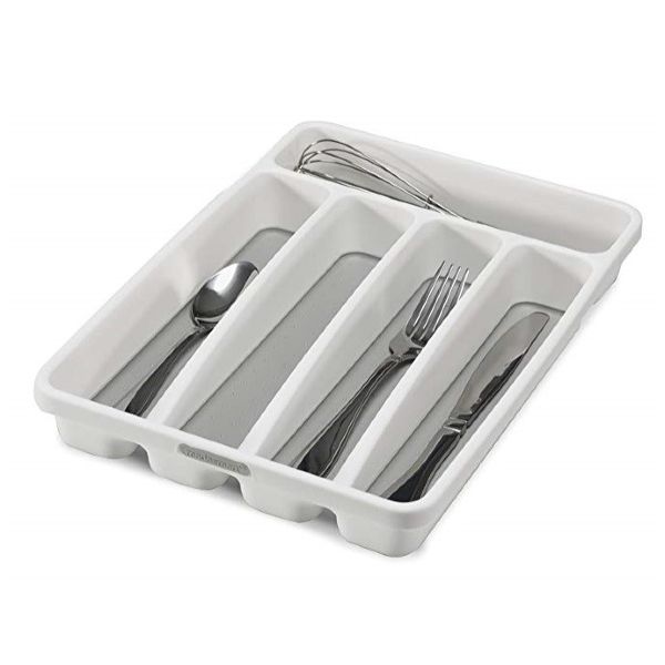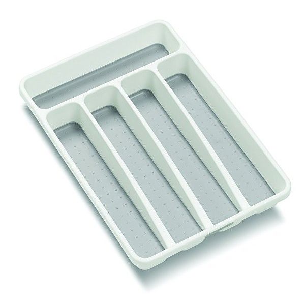 Designed for small kitchen drawers - first time apartment, condo or college residence. Five compartments for flatware Rounded corners for easy cleaning Non-slip lining and rubber-feet to keep things in place Antibacterial over mold 12.75 x 9 x 1.88 INH / 32.39 x 22.86 x 4.76 cm