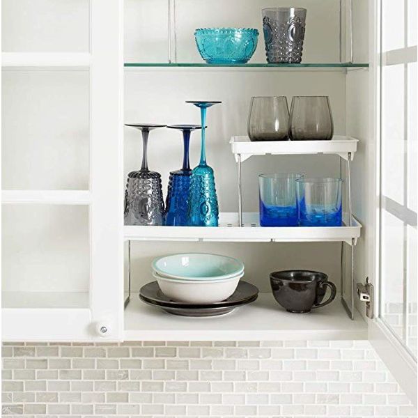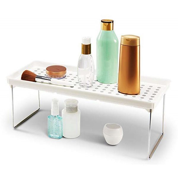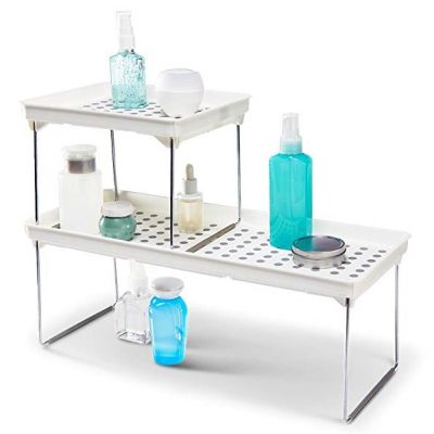 These white stackable shelves help maximize your space. Soft lining and rubber feet to keep things in place Fold flat when not in use. Each shelf can hold 25 lbs./ 11.34 kg Made of high-quality, BPA-free plastic 18.38 x 7.63 x 1.5 IN / 46.67 x 19.37 x 3.81 cm