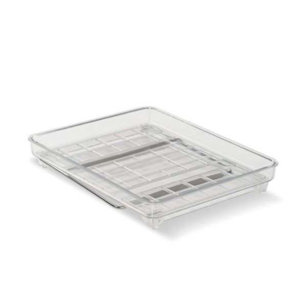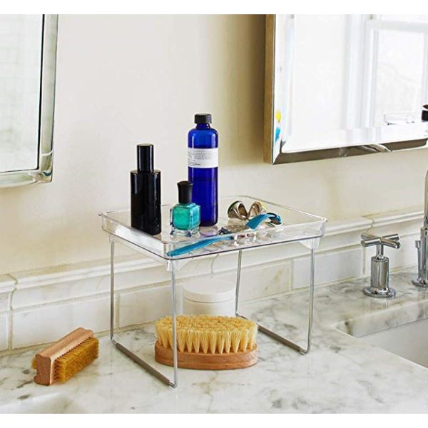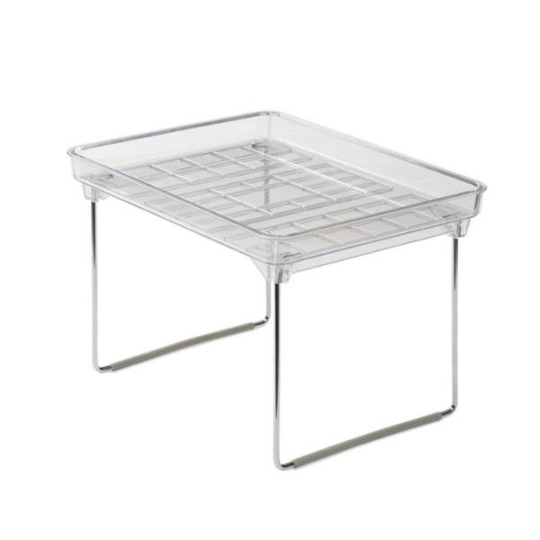These clear stackable shelves help maximize your space. Rubber feet to keep things in place Folds flat when not in use. Each shelf can hold 25 lbs. / 11.34 kg Made of high-quality, BPA-free plastic 9.50 x 7.72 x 7.0 IN / 24.13 x 19.61 x 3.81 cm