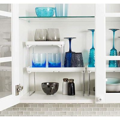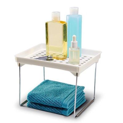 These white stackable shelves help maximize your space. Soft lining and rubber feet to keep things in place Fold flat when not in use. Each shelf can hold 25 lbs./ 11.34 kg Made of high-quality, BPA-free plastic 9.38 L x 7.63 W x 7.00 H IN / 23.81 x 19.37 x 17.78 cm