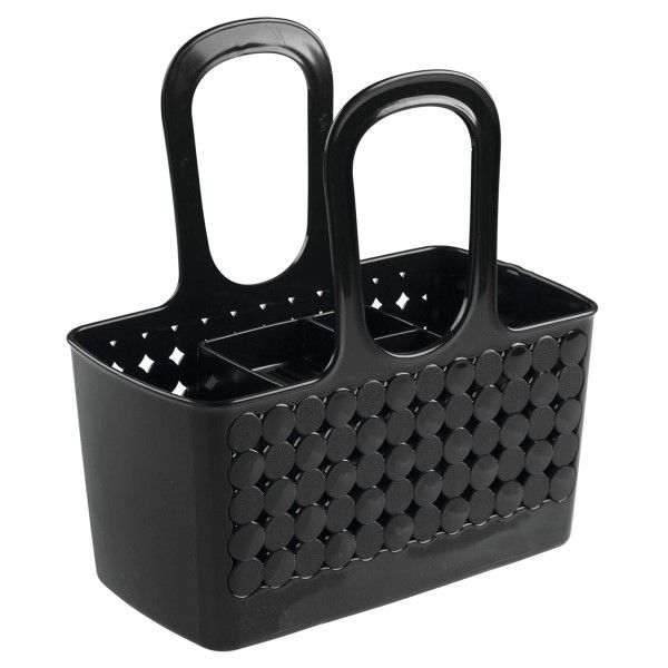 Made of durable plastic for years of quality use, the bath tote organizer has an attractive black woven design with holes at the bottom to allow water to drain after use.
