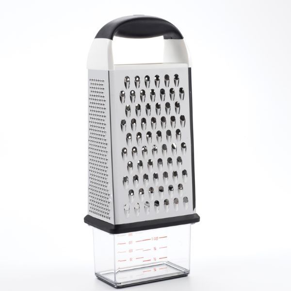 4 Sided Box Grater, 7"/18cm, stainless steel. Slim box grater features four functional grating surfaces. Large, stainless steel coarse and fine grating surfaces are great for cheese, vegetables, chocolate and more. A slimmer, super-fine grating surface is just right for nutmeg and ginger, and the slicing surface yields perfect slices of cucumber, zucchini, cheese and more. The soft handle assures acomfortable grip, and a non-slip ring keeps the box grater steady on a plate or cutting board. Also included is a storage container with non-slip ring, measurement markings and a lid for catching and storin g your freshly grated ingredients. Dishwasher safe.