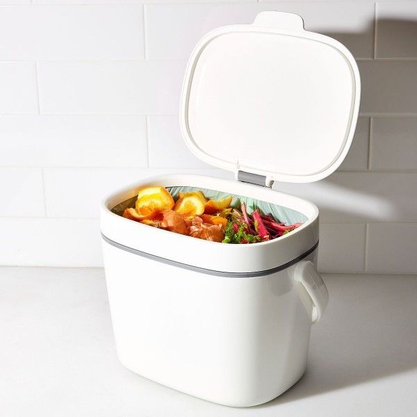 Uncomplicate composting with the OXO Good Grips Compost Bin. Designed to sit on countertops, Bin is designed to keep composting bags tucked inside for a neat look. The 1.75-gallon/6.62-liter capacity makes it perfect for culinary creatives, but the easy-to-use, stay-open lid makes it easy for anyone to use. The lid helps keep odors from escaping and the smooth interior makes it a breeze to clean, even if you don’t use composting bags. The convenient handle makes transporting the Bin easy, and the handle folds down out of the way when not in use. Body is dishwasher safe. Hand wash all other parts