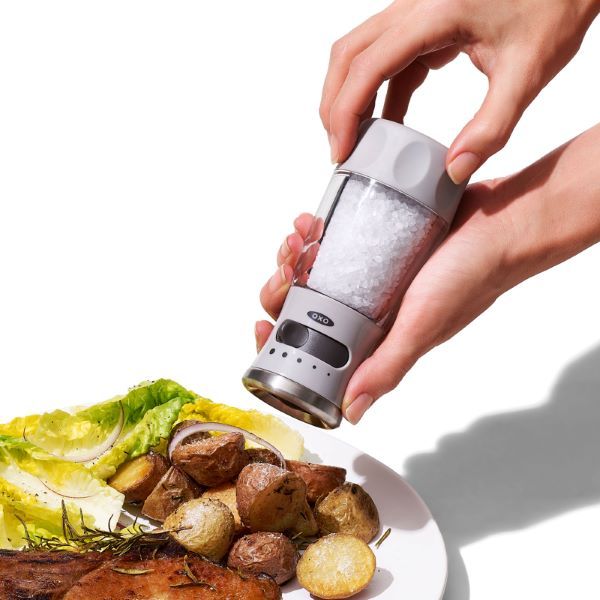 Adjustable salt grinder, grinds from the top for mess-free storage. Ajustable settings from fine to coarse. Non-corrosive ceramic mechanism won't absorb flavours or odours. Stainless steel with clear acrylic body. 14cm high. Comes pre-filled with salt.