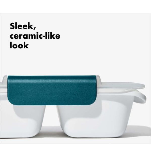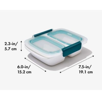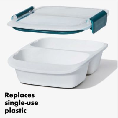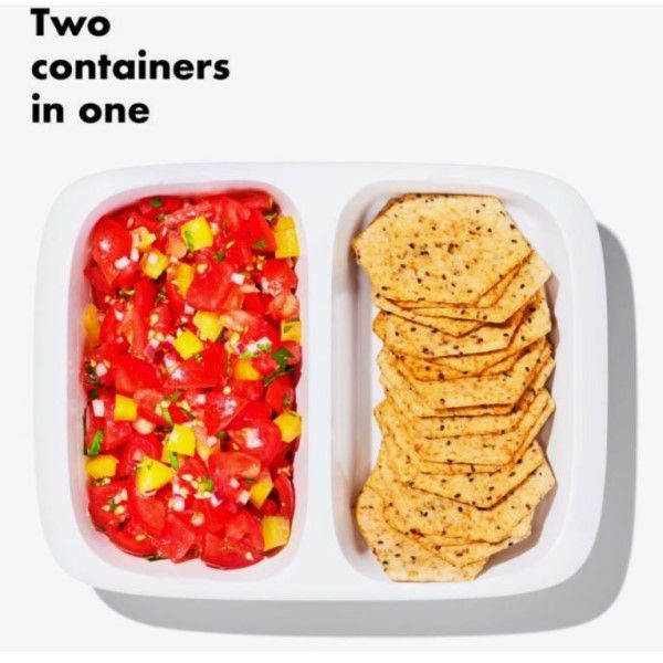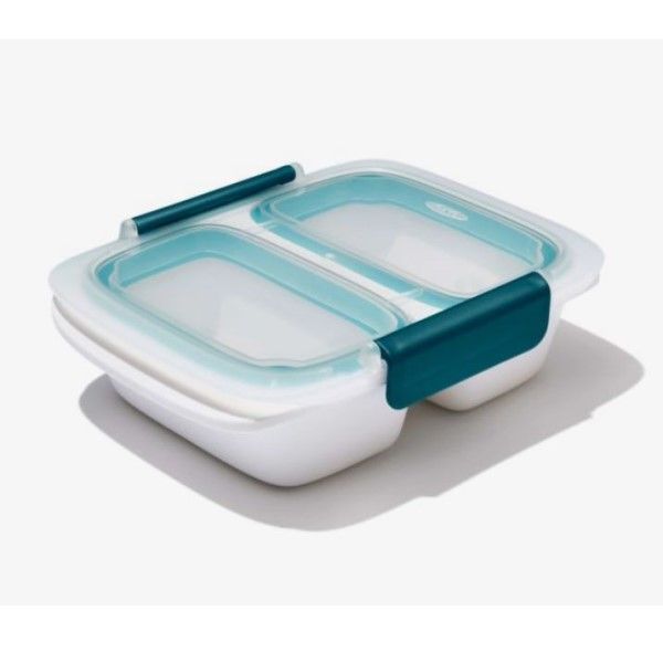 The OXO Good Grips Prep & Go 2-Cup Divided Container features two separate compartments in one container. Each side holds up to one cup of food, which means you can use it to help with portion control, meal prep and to pack fun, bento box-style meals. Fill one side with Greek yogurt and the other with berries, or use it for soup and crackers, or grilled chicken and veggies, and so on. The lid has two see-through windows (one for each compartment), two silicone gaskets to keep liquids contained, and two locking clips for extra reassurance. The base even features stay-cool handles for easy microwave-to-table transport. And while the whole thing looks like ceramic, it’s actually a much lighter BPA-free plastic that can help you replace single-use containers. Dishwasher safe. For a secure seal, press firmly in the middle of the lid, then engage the latches; you'll hear air being released as you press the lid down To replace the gasket, press the four corners down, then press the rest of the gasket into place, ensuring the gasket is pressed down fully and evenly
