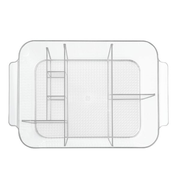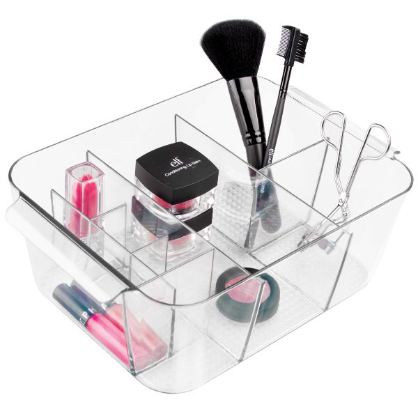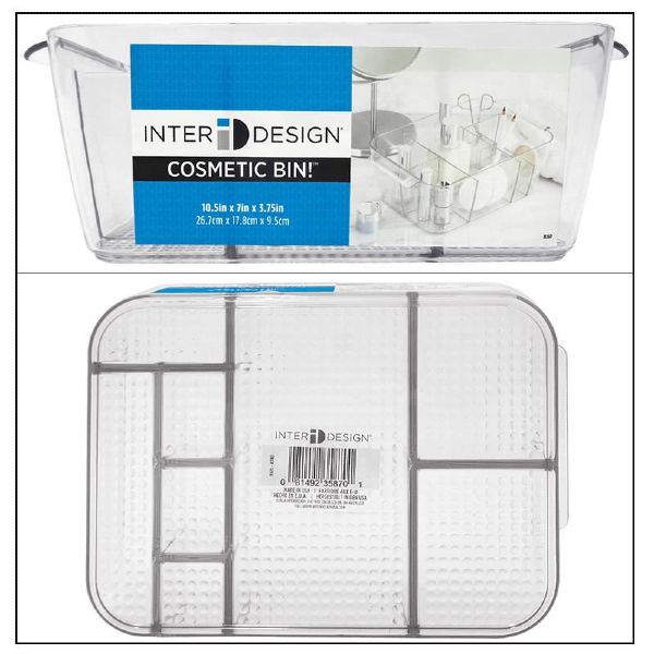 The Divided Cosmetic Bin conveniently stores your makeup and cosmetic accessories. Eight storage compartments Built -in handles Made of clear BPA-free plastic Perfect for countertop or vanity!