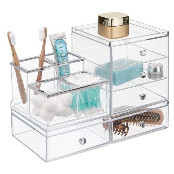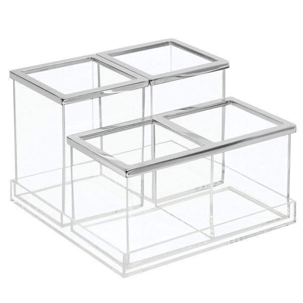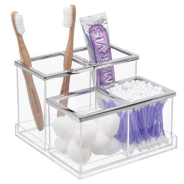 Includes four separate compartments that can be removed or reorganized to provide custom storage options for toothbrushes, toothpaste, makeup brushes, and more Open top tiered design and raised sides ensure that contents stay upright and are always visible and accessible. Use peices together or separately. Combine with other organizers for an oustanding solution - sold separately. Durable BPA-free clear plastic stands up to every day use and is easy to clean with mild soap and water