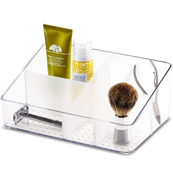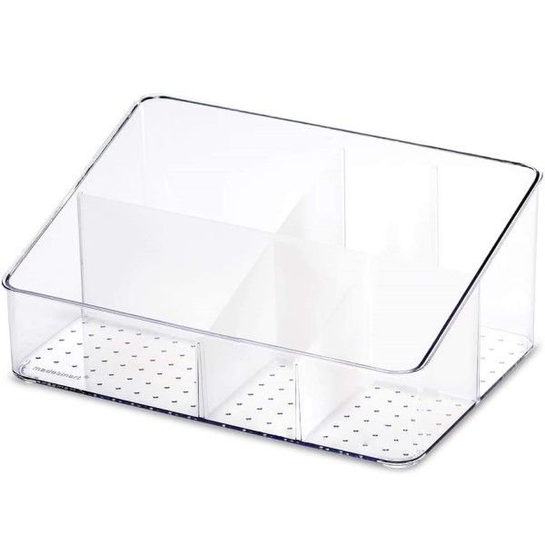 The Stacking Angle Bin keeps items divided, tidy, and easy to access. Six different sized compartments Tall back allows for taller items Shorter front enhances a grab and go feature. The stacking technology allows for easy storage customization.