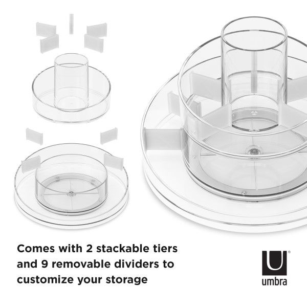 Cascada’s organic shape and multiple storage compartments create an eye-catching look while providing organizational storage. A makeup organizer with a swivelling base, Cascada features two separate compartments that can be stacked on top of one another or used in different places. Cascada comes with 9 removable and customizable dividers that can be placed in the organizer to create separation and extra compartments. With a clear acrylic finish, Cascada has multiple tiers for versatile storage.