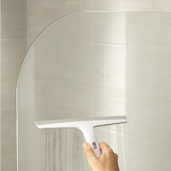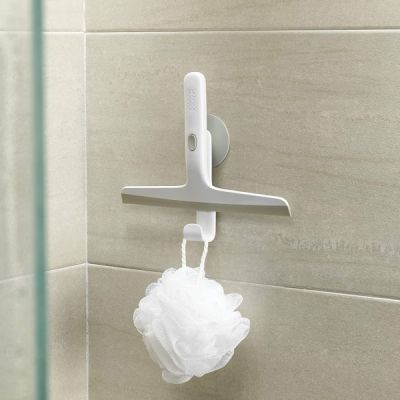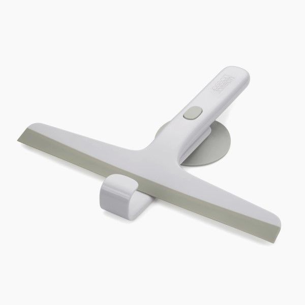 This compact shower squeegee comes with its own storage holder that attaches securely to tiles or a glass shower screen and includes a handy hook for hanging a range of bathroom accessories.