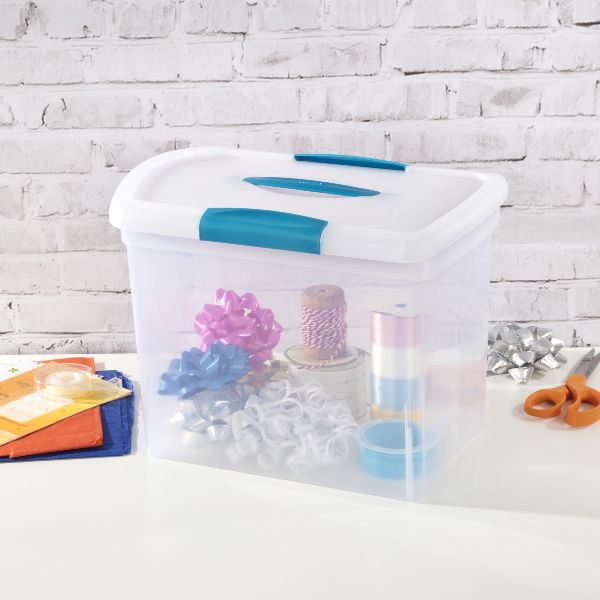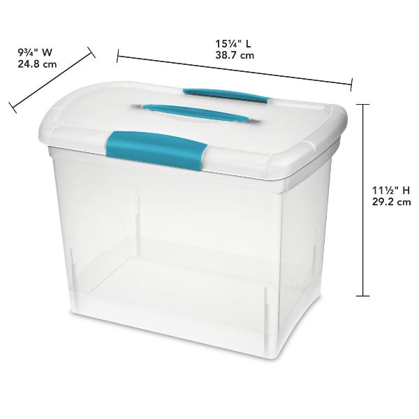 Accommodates letter size hanging folders and is a great solution for storing, organizing and carrying small items around the home, office, or classroom. Clear base for easy identification of contents Durable latches ensure lid remains attached to base Comfortable handle for one-handed carrying 15.25 x 9.75 x 11.5 IN H / 38.7 x 24.8 x 29.2cm