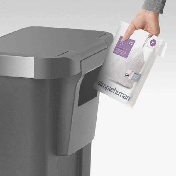 This simplehuman 45L plastic waste can looks great and is built to last. The strong steel pedal and patented lid-shox technology make for easy opening and quiet closing. The stainless steel liner rim isn't just for looks - it closes over the liner to hold it in place and keep it hidden from sight. A revolutionary liner pocket holds a 20-pack of liners, making them easy to dispense one-by-one from inside the can.