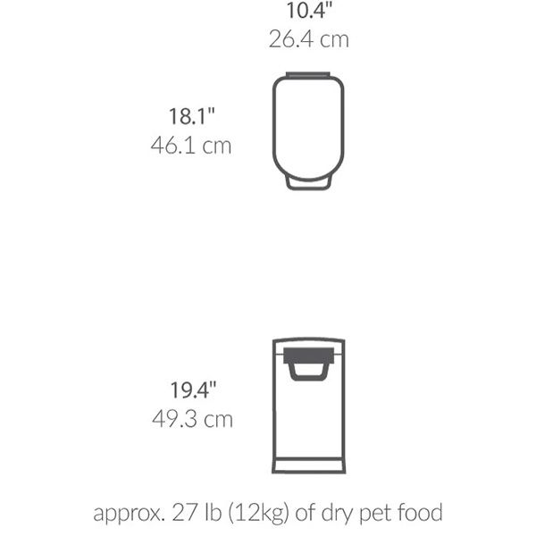 This simplehuman stainless steel pet food can is beautiful and functional. Robust lock-tight handle keeps food in and pets out. Silicone gasket forms an airtight seal so food stays fresh. Convenient scoop attaches magnetically under the lid. Medium capacity (25-29 lb/11-13 kg) is ideal for storing dog or pet food, or other bulk items like flour, rice, sugar or charcoal. 10.4W x 18.1D x 19.4H inches / 26.4W x 46.1D x 49.3H cm