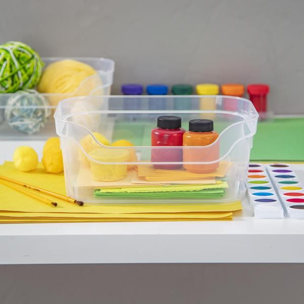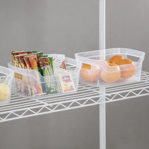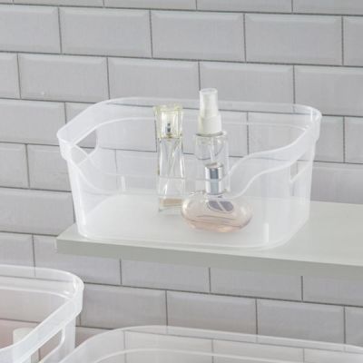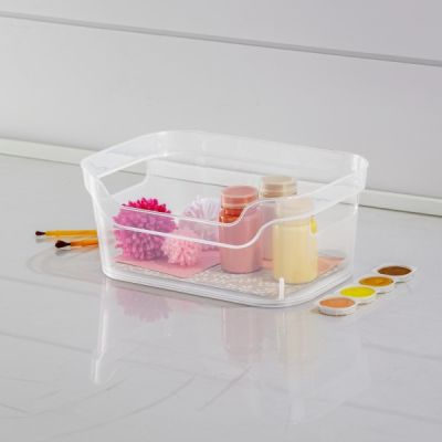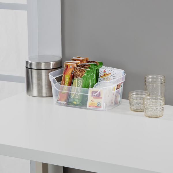 Open Bins are a portable storage solution that makes organization easy and efficient! Whether you are cleaning up the kitchen pantry or bringing order to the bathroom closet, these bins will help get the job done. Available in 3 different sizes, Open Bins are perfect for organizing any closet or shelving space around the home. The Small Open Bins are sold in a handy 2-pack and are ideal for storing anything from snacks, juice boxes, and canned goods to office supplies, craft items, and hair and beauty products. The scoop front offers a convenient way to view, store and retrieve items quickly and easily, while the carry-through handles make for effortless and comfortable transport. The sturdy, banded rim adds a stylish touch to the bins, while the modern, clear design works well with any home décor. The bins feature polished sides and a textured bottom that are both easy to clean. The overall assembled dimensions of this item are 9 1/2" L x 6 1/2" W x 4" H. The scoop front offers easy access to all stored items Carry-through handles provide full grip access and improve portability Designed to fit inside of most pantry cabinets Polished sides and easy to clean textured bottom Sturdy, banded rim adds a stylish touch Modern, clear design works with any home décor BPA-free and phthalate-free Proudly made in the USA