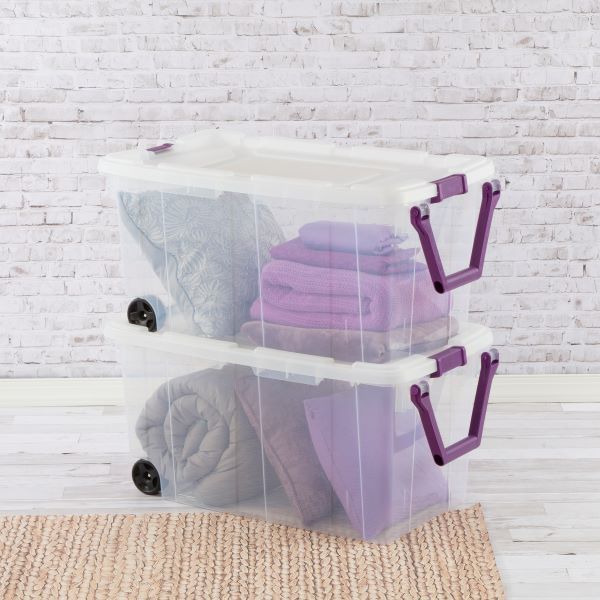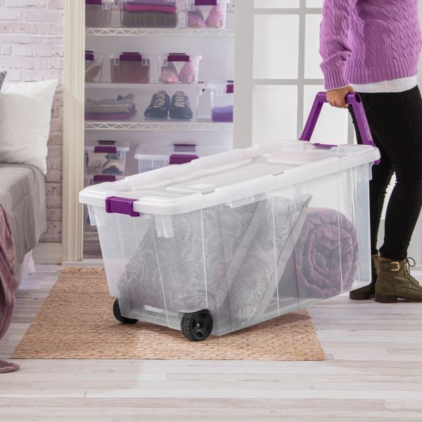 Looking for a storage solution for your large and bulky items? The Sterilite 151L Wheeled Storage Box is ideal for bulky clothes, bedding, seasonal decorations, and more! Need to take your storage on the go? The ergonomic handle rotates up for easy pulling while the large wheels and metal axle allow for rolling over rough surfaces. The clear lid and base allow contents to be seen and easily identified for quick retrieval. The robust latches offer extra security that the lid will stay attached to the base, and the textured surface makes for a sure grip when carrying. The grooved lid design and keyholes provide options for tie-downs to simplify transportation, and keep totes in place. The innovative drip-resistant lid provides maximum protection against items getting wet. The deep recessed lids provide stability when stacking for efficient use of vertical storage space. The overall assembled dimensions of this item are 36 3/4" L x 21 3/8" W x 18" H.