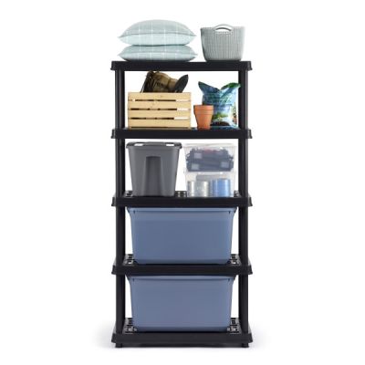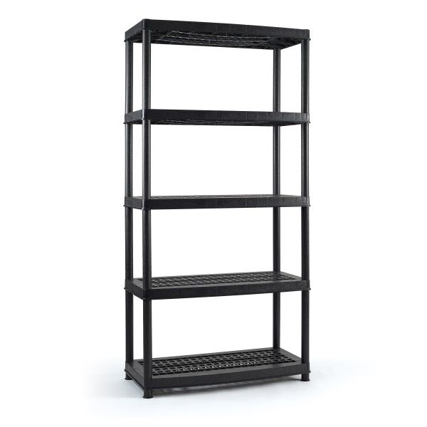 An easy-to-assemble storage organizer that sets up in minutes without the use of tools. 36"W x 18"D x 72"H Weight capacity 150lbs per shelf Weather restsitant to withstand rusting, denting or peeling. Made from eco-friendly recycled resin. MADE IN CANADA