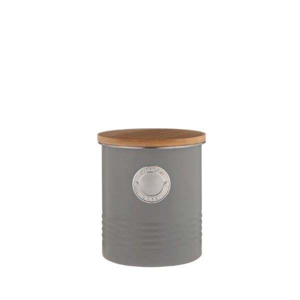 Storage Canister, 1L, round. Matte grey finish. Ideal to store dry food and other goods. Accented with a round silver name plate and includes assorted stickers (english and french). Bamboo lid is fitted with an airtight silicone seal to keep contents fresh. Made from 100% recyclable steel and sustainably sourced bamboo.