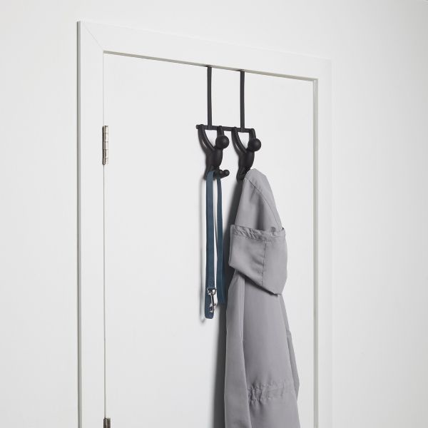 BUDDY double over the door . With two times the fun, buddy hangs on to the door and your coat! Comes with all necessary hardware and is easy to install, fits doors up to 1.5 IN / 3.8cm thick Great for hanging coats, purses, scarves by your exit, or towels and robes in your washroom Black finish - also available in white Each of these hooks holds 5 lbs. / 2.27 kgs 12.5 x 8.5 x 4.25 IN / 31.8 x 21.6 x 10.8 cm