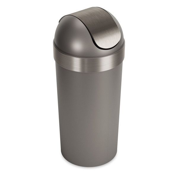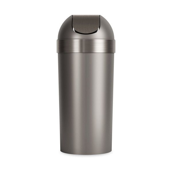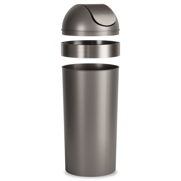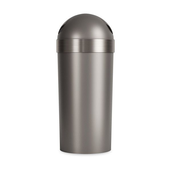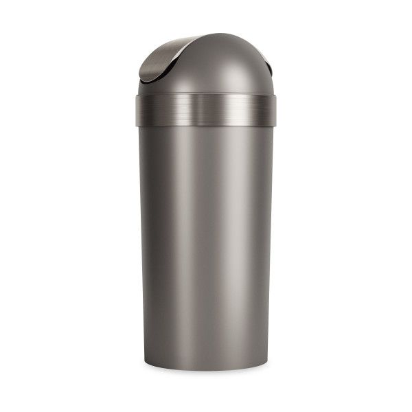 Style meets function with this large, easy-to-use garbage can. With sleek brushed metallic accents, a hassle-free molded swing-top lid, and an integrated neck ring, Venti keeps your waste out of sight. Venti Trash Can is sturdy, stable, and constructed of durable black polypropylene, which can be quickly wiped down with a damp cloth. Venti Trash Can is 35 inches (89 cm) tall by 14.6 inches (37 cm) in diameter, with a 16-gallon (62L) capacity. It works with 30-gallon garbage bags, including draw-sting and flap-tie bags. Venti is large enough in size so the bag doesn’t require constant changing but compact enough to fit in almost any space in your home.