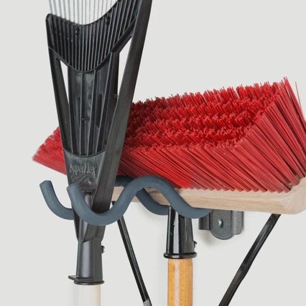 Holds brooms, rakes, shovels and more Easy installation in any wood stud with included hardware. Molded arm pads protect items from scratches & hold in place. Industrial-grade powdercoated steel & custom arm covers. Capacity 50 lb / 22 kg