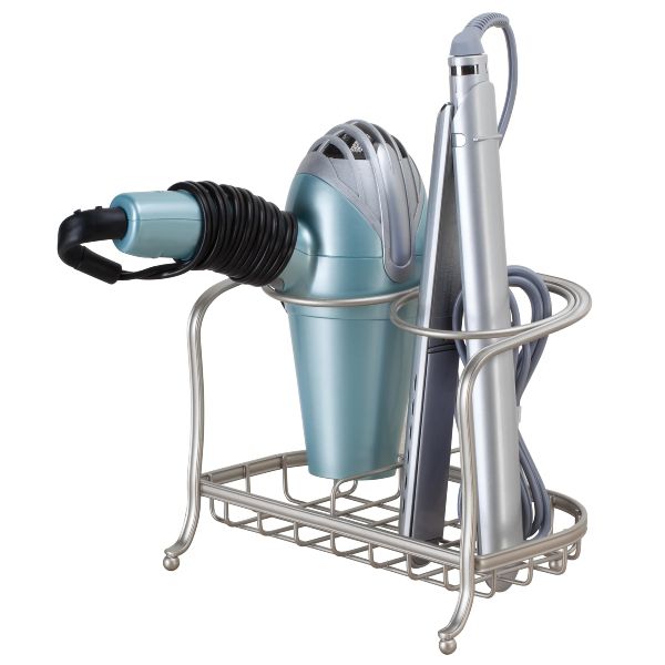 • Holds hair dryer, flat iron, and curling iron.